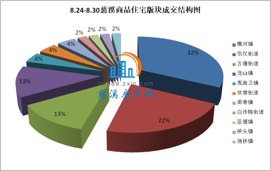 慈溪商品住宅(含别墅)各版块成交情况中,城区版块(浒山街道、古塘街道、白沙路街道、宗汉街道、坎墩街道)共成交39套,成交均价9413.36元/㎡。排名前三版块:横河镇备案31套,占32%;宗汉街道备案21套,占22%;古塘街道与龙山镇各备案12套,各占13%。