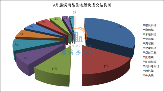 9月慈溪商品住宅版块成交中,城区楼盘(浒山街道、古塘街道、白沙路街道、坎墩街道、宗汉街道)成交188套,成交均价9381.61元/㎡。宗汉街道成交112套,占当月全市总成交量33%;横河镇成交备案58套,占当月全市总成交量17%;古塘街道成交备案35套,占当月全市总成交量10%。