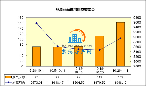 上周是楼市“金九银十”十月份的尾巴,商品房成交量上升明显。上周金地鸿悦27周年庆生,共享27米超级蛋糕;御溪雅苑推出玲珑墅236万起,31日样板房盛大开放;31日杭州湾兆丰国际商贸城全球招商启动仪式成功举行。