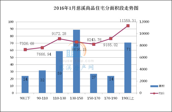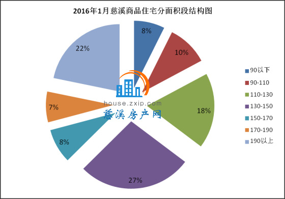 1月慈溪商品住宅分面积段成交中,130-150㎡面积段产品成交89套,成交均价8616.15元/㎡,占总成交套数的27%,销量排名第一;190㎡以上面积段产品成交71套,成交均价11359.31元/㎡,占总成交套数的22%,销量排名第二;110㎡-130㎡面积段产品成交59套,成交均价9172.28元/㎡,占总成交套数的18%,销量排名第三。