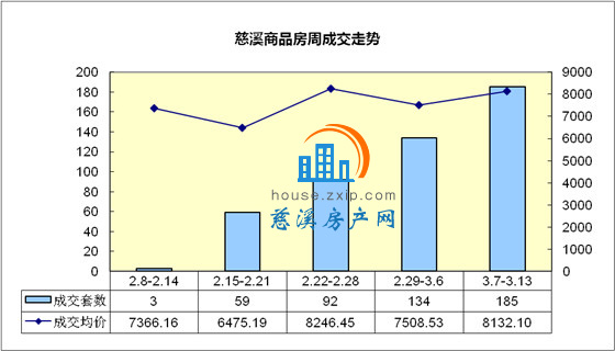 上周(3.7-3.13)成交各类房源(含住宅、公寓、商铺、写字楼和车库)共计185套,成交均价8132.1元/㎡,成交面积18797.93方。环比上上周成交量上升38.06%,成交均价上升9.64%,成交面积上升14.51%。