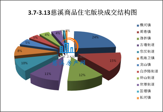 慈溪商品住宅(含别墅)各版块成交情况中,城区版块(浒山街道、古塘街道、白沙路街道、宗汉街道、坎墩街道)共成交38套,成交均价10630.07元/㎡。排名前三版块:横河镇备案27套,占上周商品住宅成交总量24%;周巷镇备案17套,占上周商品住宅成交总量的15%;逍林镇备案14套,占上周商品住宅成交总量12%。
