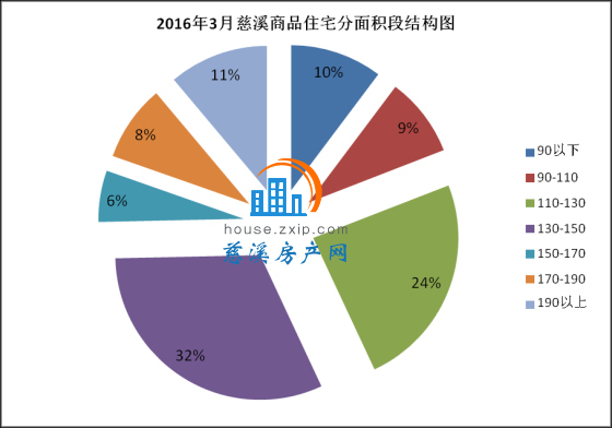 3月慈溪商品住宅按面积段成交中,130-150㎡面积段产品成交182套,成交均价7758.63元/㎡,占总成交套数的32%,销量排名第一;110-130㎡面积段产品成交138套,成交均价7593.61元/㎡,占总成交套数的24%,销量排名第二;190㎡以上面积段产品成交64套,成交均价10510.46元/㎡,占总成交套数的11%,销量排名第三。