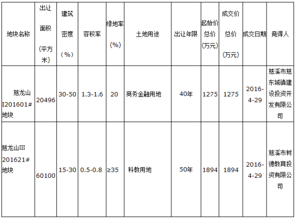 (编号:CXGTCR2016008)慈溪市国有建设用地使用权拍卖出让结果公布(龙山1宗商务金融用地、1宗科教用地)