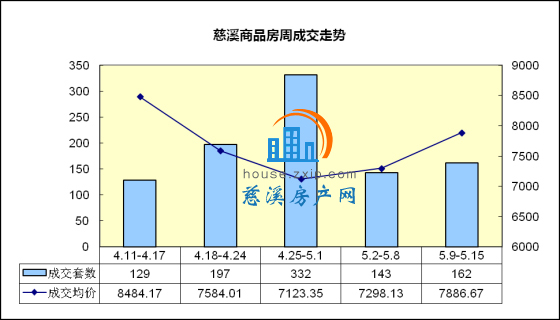 上周(5.9-5.15)成交各类房源(含住宅、公寓、商铺、写字楼和车库)共计162套,成交均价7886.67元/㎡,成交面积15315.86方。环比上上周成交量上升13.29%,成交均价上升8.06%,成交面积下降0.2%。