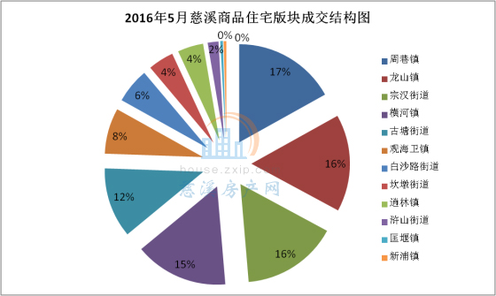 5月慈溪商品住宅版块成交中,城区楼盘(浒山街道、古塘街道、白沙路街道、坎墩街道、宗汉街道)成交176套,成交均价9875.90元/㎡。周巷镇成交备案76套,占当月全市总成交量17%;龙山镇成交备案72套,占当月全市总成交量16%;宗汉街道成交备案71套,占当月全市总成交量16%。