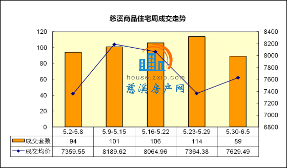 上周(5.30-6.5)成交各类房源(含住宅、公寓、商铺、写字楼和车库)共计149套,成交均价7111.64元/㎡,成交面积16335方。环比上上周成交量下降11.31%,成交均价下降4.54%,成交面积下降6.23%。