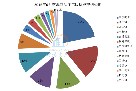 6月慈溪商品住宅版块成交中,城区楼盘(浒山街道、古塘街道、白沙路街道、坎墩街道、宗汉街道)成交184套,成交均价9789.40元/㎡。宗汉街道成交备案99套,占当月全市总成交量22%;横河镇成交备案79套,占当月全市总成交量17%;龙山镇成交备案58套,占当月全市总成交量13%。