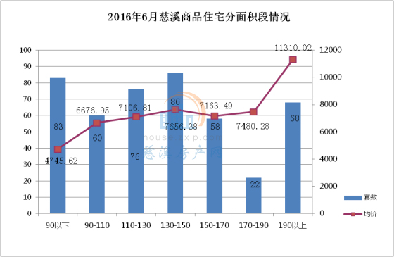 6月慈溪商品住宅按面积段成交中,130-150㎡面积段产品成交86套,成交均价7656.38元/㎡,占总成交套数的19%,销量排名第一;90㎡以下面积段产品成交83套,成交均价4745.62元/㎡,占总成交套数的18%,销量排名第二;110-130㎡面积段产品成交76套,成交均价7106.81元/㎡,占总成交套数的17%,销量排名第三。