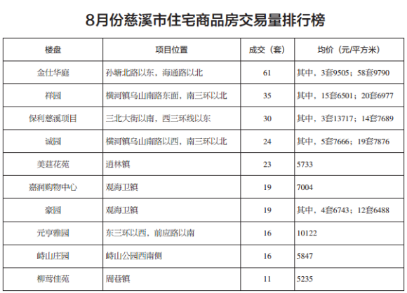 8月,全市成交量超过10套的楼盘为11个,其中超过30套的楼盘3个,分别是金仕华庭、祥园和保利慈溪项目,成交量为61套、35套和30套,诚园和美莛花苑两个楼盘成交量超过20套,分别为24套和23套,嘉润购物中心和豪园成交量比较接近20套,均成交了19套。在8月慈溪市住宅商品房交易量排行榜单上,成交量超过10套的楼盘还有元亨雅园、峙山庄园和柳莺佳苑,元亨雅园和峙山庄园均成交16套,柳莺佳苑成交11套。金仕华庭已是连续两个月位于全市住宅商品房成交第一名,7月成交量是52套。