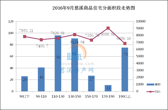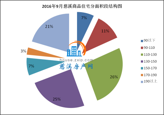 9月慈溪商品住宅按面积段成交中,110-130㎡面积段产品成交96套,成交均价7626.81元/㎡,占总成交套数的26%,销量排名第一;130-150㎡面积段产品成交91套,成交均价8124.04元/㎡,占总成交套数的25%,销量排名第二;190㎡以上面积段产品成交75套,成交均价6856.16元/㎡,占总成交套数的21%,销量排名第三。