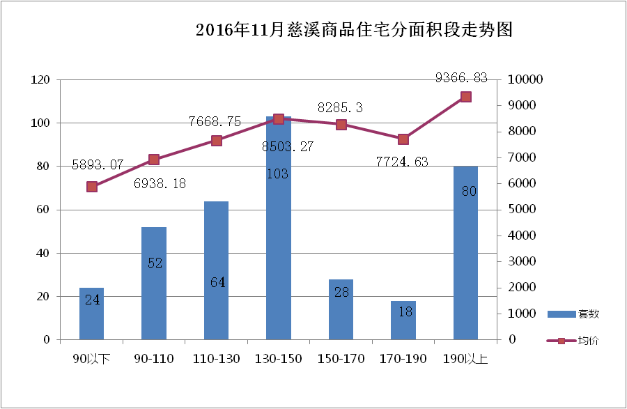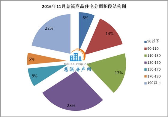 11月慈溪商品住宅按面积段成交中,130-150㎡面积段产品成交103套,成交均价8503.27元/㎡,占总成交套数的28%,销量排名第一;190㎡以上面积段产品成交80套,成交均价9366.83元/㎡,占总成交套数的22%,销量排名第二;110-130㎡以上面积段产品成交64套,成交均价7668.75元/㎡,占总成交套数的17%,销量排名第三。