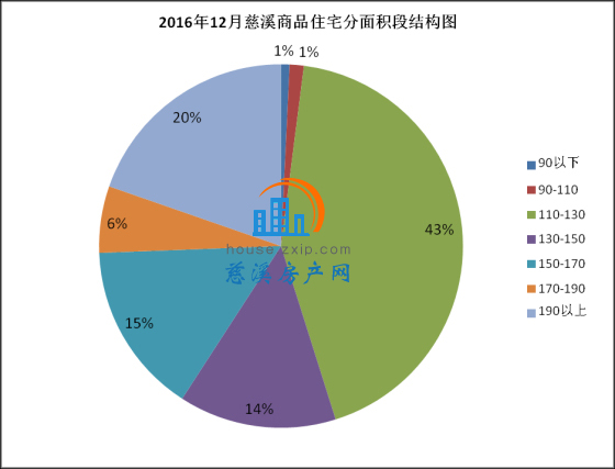 12月慈溪商品住宅按面积段成交中,110-130㎡面积段产品成交342套,成交均价6787元/㎡,占总成交套数的43%,销量排名第一;190㎡以上面积段产品成交156套,成交均价10217.38元/㎡,占总成交套数的20%,销量排名第二;150-170㎡以上面积段产品成交121套,成交均价9283.24元/㎡,占总成交套数的15%,销量排名第三。