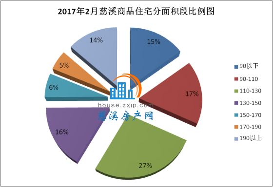 2月慈溪商品住宅按面积段成交中,110-130㎡面积段产品成交71套,占总成交套数的27%,销量排名第一;90㎡-110㎡面积段产品成交45套,占总成交套数的17%,销量排名第二;130-150㎡面积段产品成交44套,占总成交套数的16%,销量排名第三。