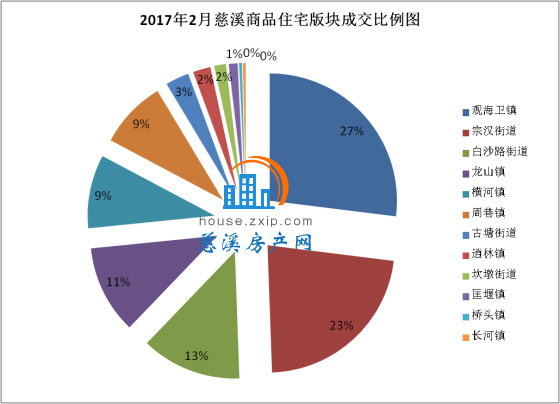 2月慈溪商品住宅版块成交中,城区楼盘(浒山街道、古塘街道、白沙路街道、坎墩街道、宗汉街道)成交106套,成交均价10101.29元/㎡。观海卫镇成交备案72套,占当月全市总成交量27%;宗汉街道成交备案60套,占当月全市总成交量23%;白沙路街道成交备案34套,占当月全市总成交量13%。