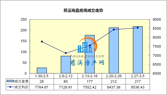 上周(2.27-3.5)成交各类房源(含住宅、公寓、商铺、写字楼和车库)共计217套,成交均价8536.43元/㎡,成交面积19480方。环比上上周成交量上涨2.36%,成交均价上涨1.17%,成交面积上涨19.04%。