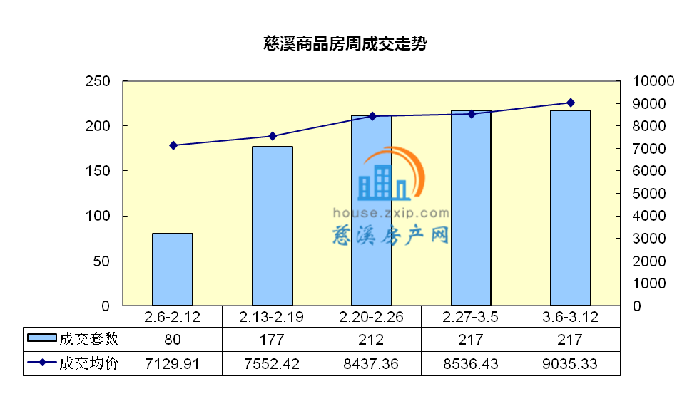 上周(3.6-3.12)成交各类房源(含住宅、公寓、商铺、写字楼和车库)共计217套,成交均价9035.33元/㎡,成交面积20333方。环比上上周成交量持平,成交均价上涨5.84%,成交面积上涨4.38%。