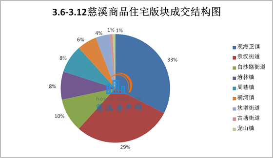 慈溪商品住宅(含别墅)各版块成交情况中,城区版块(浒山街道、古塘街道、白沙路街道、宗汉街道、坎墩街道)共成交53套,成交均价11173.52元/㎡。排名前三版块:观海卫镇备案39套,占上周商品住宅成交总量的33%;宗汉街道备案35套,占上周商品住宅成交总量的29%;白沙路街道备案12套,占上周商品住宅成交总量的10%