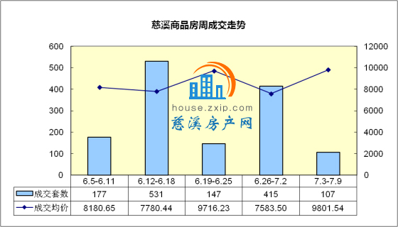 上周(7.3-7.9)成交各类房源(含住宅、公寓、商铺、写字楼和车库)共计107套,成交均价9801.54元/㎡,成交面积10175方。环比上上周成交量下跌74.22%,成交均价上涨29.25%,成交面积下跌46.06%。从周成交走势图看,由于金仕华庭车位在6.12-6.18集中备案,绿城诚园车位在6.26-7.2集中备案,近五周的商品房成交量呈现较大的波动。