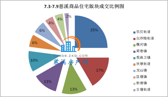 慈溪商品住宅(含别墅)各版块成交情况中,城区版块(浒山街道、古塘街道、白沙路街道、宗汉街道、坎墩街道)共成交24套,成交均价11805.48元/㎡。排名前三版块:宗汉街道备案12套,占上周商品住宅成交总量的25%;白沙路街道备案8套,占上周商品住宅成交总量的17%;横河镇与周巷镇各备案6套,各占上周商品住宅成交总量的13%。