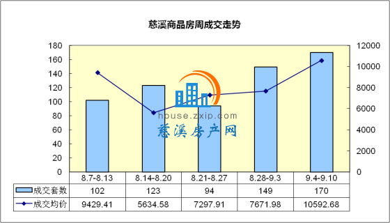 上周(9.4-9.10)成交各类房源(含住宅、公寓、商铺、写字楼和车库)共计170套,成交均价10592.68元/㎡,成交面积17628方。环比上上周成交量上涨14.09%,成交均价上涨38.07%,成交面积上涨57.82%。