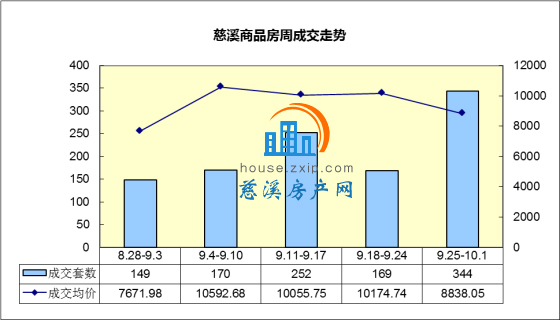 上周(9.11-10.1)成交各类房源(含住宅、公寓、商铺、写字楼和车库)共计344套,成交均价8838.05元/㎡,成交面积38665方。
