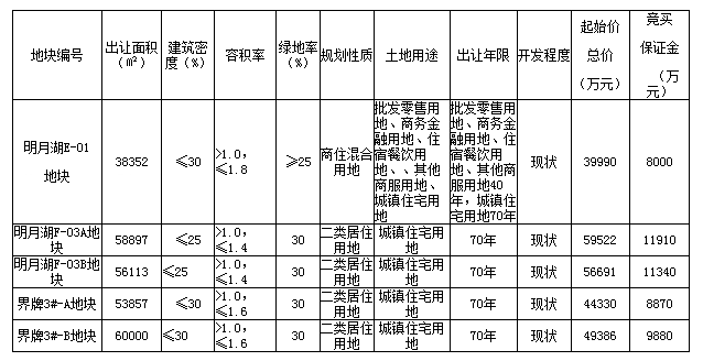 二、出让地块的规划指标、土地用途、出让年限、起始价总价及竞买保证金等如下: