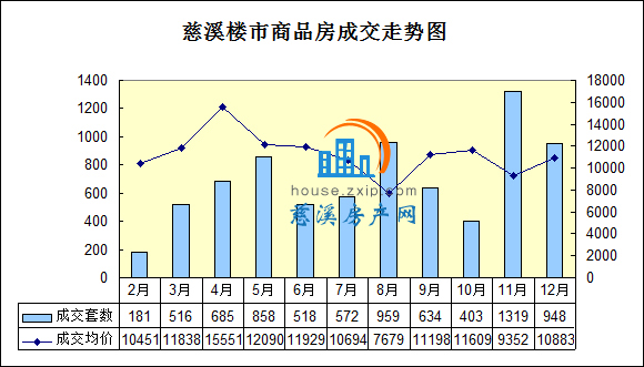 据慈溪房产网数据统计显示,12月份慈溪新房市场共成交商品房(含住宅、公寓、商铺、写字楼和车位)948套(包含人才公寓星光家园18套),成交均价10883.1元/平方米,环比11月份,成交量下降28.1%,成交均价提高16.4%。然而11月份星光家园成交量达330套,可见11月与12月成交量基本持平。12月份新开盘三个项目:分别是位于周巷镇的上品轩与绿城惠园,以及位于古塘街道的绿城御园,三个新盘共占成交量的20%。 前三甲中,御溪雅苑成交175套,上品轩166套,金地鸿悦63套。
