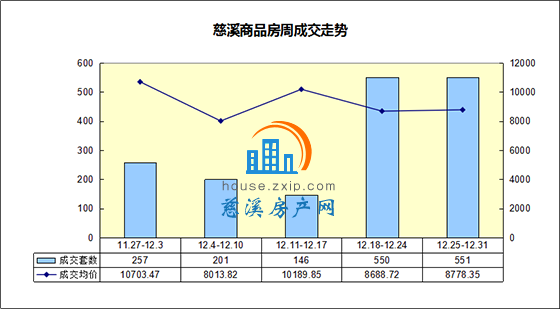 上周(12.25-12.31)成交各类房源(含住宅、公寓、商铺、写字楼和车库)共计551套,成交均价8778.35元/㎡,成交面积25435.23方。环比上上周成交量持平,成交均价基本持平。