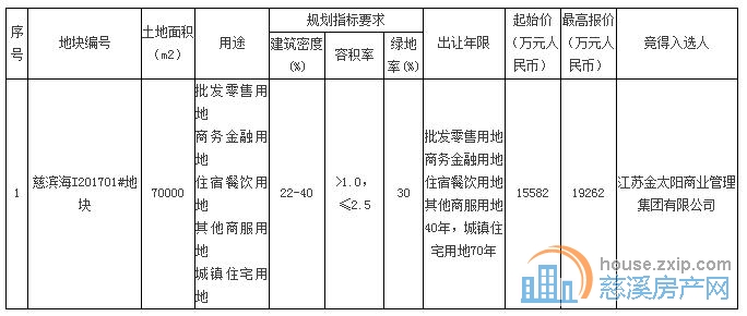 慈溪市国有建设用地使用权挂牌出让结果(编号:CXGTCR2017032)