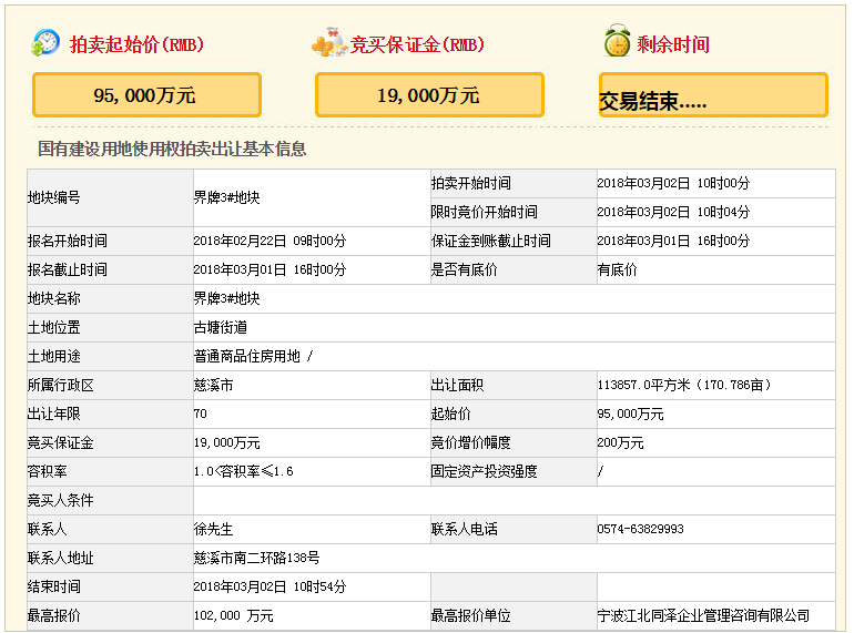 经过32轮竞拍,最终 由宁波江北同泽企业管理咨询有限公司(碧桂园),以楼面价5599.13元/㎡,总价102000万元竞得界牌3#地块,溢价率7.4%。