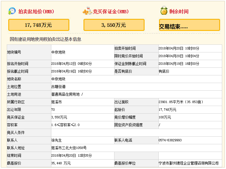 经过124轮竞拍,最终由宁波鄞州德珵企业管理咨询有限公司(金地),以楼面价7415元/㎡,总价35448万元竞得中京地块,溢价率99.7%。
