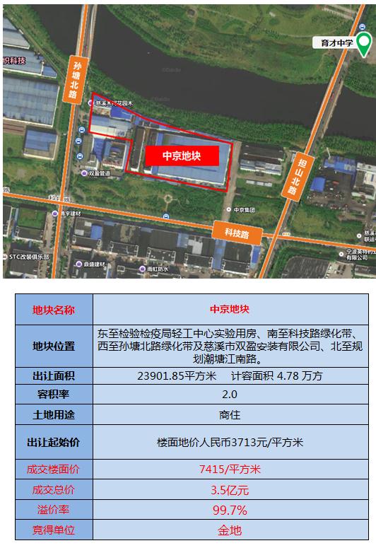 中京地块位于古塘街道, 中京地块东至检验检疫局轻工中心实验用房、南至科技路绿化带、西至孙塘北路绿化带及慈溪市双盈安装有限公司、北至规划潮塘江南路。总出让面积为23901.85㎡(35.853亩),容积率1.6-2.0,挂牌楼面价3713元/平方米,规划性质为普通商品住宅用地。