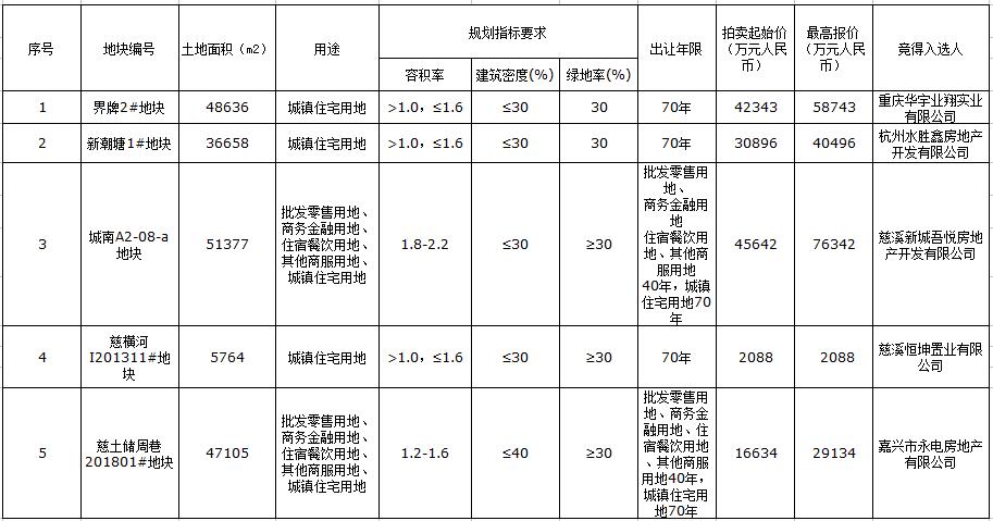 5月15日慈溪5宗地块拍卖竞价结果