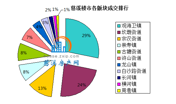 慈溪各版块各类房源成交情况中,观海卫镇27套,占29%;坎墩街道22套,占24%;宗汉街道12套,占13%。