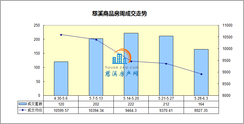 上周(5.28-6.3)成交各类房源(含住宅、公寓、商铺、写字楼和车库)共计164套,成交均价8927.35元/㎡,成交面积15786.09方。环比上周成交量下跌22.6%,成交均价下降4.73%。