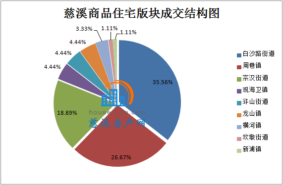 慈溪商品住宅(含别墅)各版块成交情况中,城区版块(浒山街道、古塘街道、白沙路街道、宗汉街道、坎墩街道)共成交54套,成交均价11862.04元/㎡。排名前三版块:白沙路街道上周备案32套,占上周商品住宅成交总量的35.56%;周巷镇备案24套,占上周商品住宅成交总量的26.67%;宗汉街道备案17套,占上周商品住宅成交总量的18.89%。