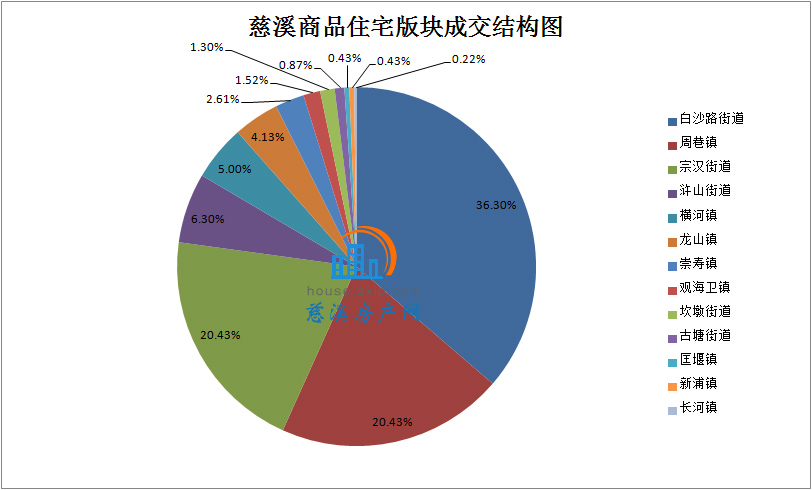 5月慈溪商品住宅版块成交中,城区楼盘(浒山街道、古塘街道、白沙路街道、坎墩街道、宗汉街道)成交300套,成交均价11993.43元/㎡。白沙路街道成交备案167套,占当月全市总成交量36.3%;周巷镇、宗汉街道均成交备案94套,占当月全市总成交量20.43%;浒山街道成交备案29套,占当月全市总成交量6.3%。