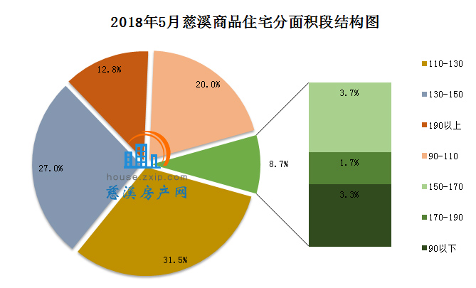5月慈溪商品住宅按面积段成交中,110㎡-130㎡面积段产品成交145套,占总成交套数的31.5%,最受慈溪购房者欢迎;130㎡-150㎡面积段产品成交124套,占总成交套数的27.0%,销量排名第二;90㎡-110㎡面积段产品成交92套,占总成交套数的20%,销量排名第三。