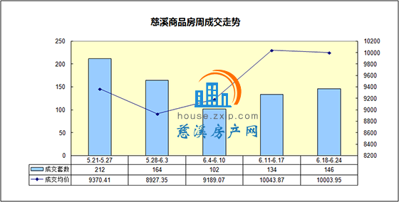 上周(6.18-6.24)成交各类房源(含住宅、公寓、商铺、写字楼和车库)共计146套,成交均价10003.9465元/㎡,成交面积14707.67方。环比上上周成交量上涨8.96%,成交均价基本持平。
