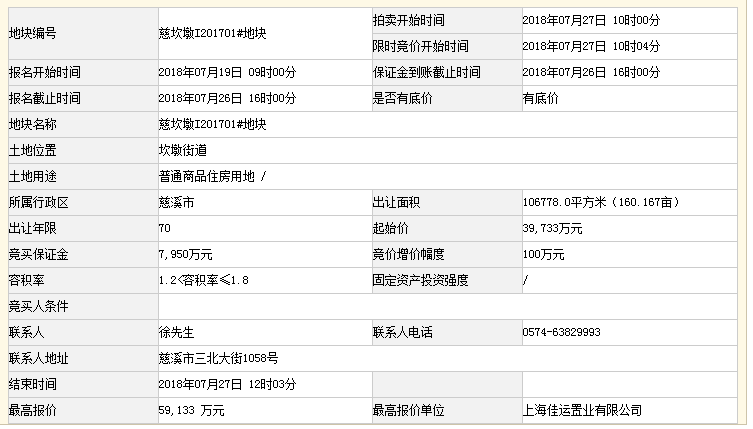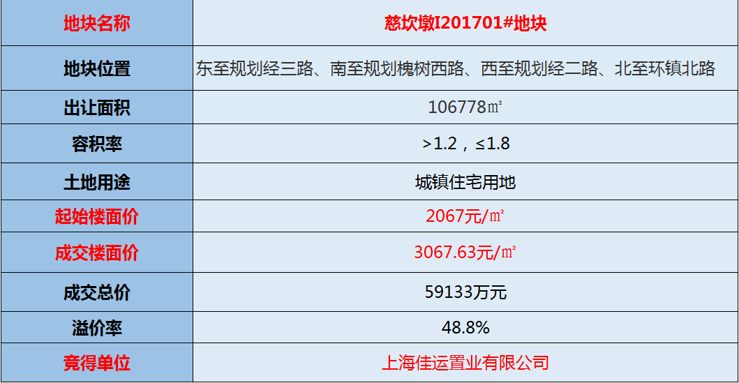 慈坎墩I201701#地块今天上午10点开拍,经过2个多小时、96轮竞拍,最终由上海佳运置业有限公司,以楼面价3076.63元/㎡,总价59133万元竞得,溢价率48.8%成功竞得该地块。