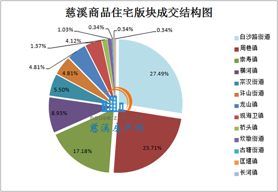 7月慈溪商品住宅版块成交中,城区楼盘(浒山街道、古塘街道、白沙路街道、坎墩街道、宗汉街道)成交114套,成交均价12424.37元/㎡。白沙路街道成交备案80套,占当月全市总成交量27.49%;宗汉街道均成交备案69套,占当月全市总成交量23.71%;龙山镇成交备案50套,占当月全市总成交量17.18%。