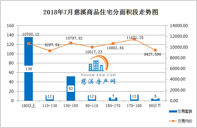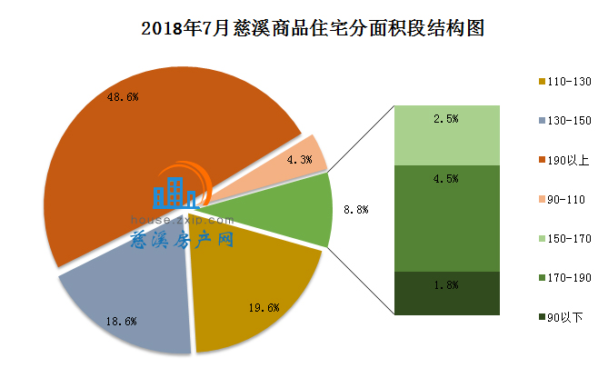 7月慈溪商品住宅按面积段成交中,190㎡以上面积段产品成交136套,占总成交套数的48.6%,最受慈溪购房者欢迎;110㎡-130㎡面积段产品成交55套,占总成交套数的19.6%,销量排名第二;130㎡-150㎡以上面积段产品成交62套,占总成交套数的18.57%,销量排名第三。