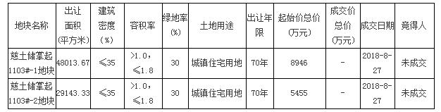 慈溪市国土资源局于2018年8月14日至2018年8月27日举行慈土储掌起1103#-1地块、慈土储掌起1103#-2地块国有建设用地使用权挂牌出让活动。现挂牌出让活动结束,将出让结果公布如下: