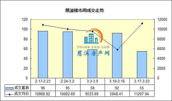 慈溪上周(3.17-3.23)成交各类房源(含住宅、公寓、商铺、写字楼和车库)共计55套,成交均价11207.94元/㎡。