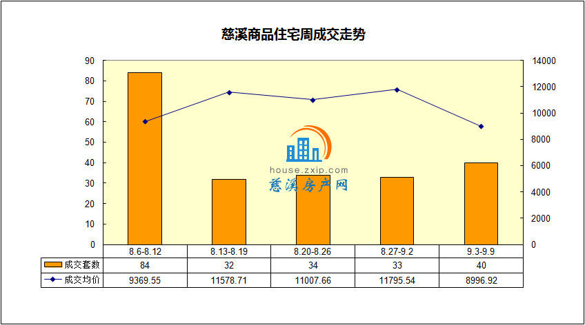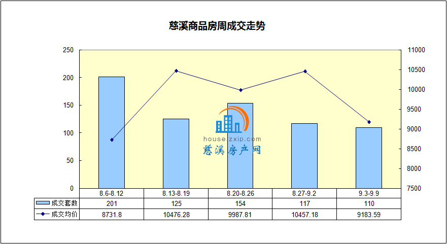 上周(9.3-9.9)成交各类房源(含住宅、公寓、商铺、写字楼和车库)共计110套,成交均价9183.59元/㎡,成交面积8163.92方。环比上上周成交量下跌5.98%,成交均价下跌12.18%。