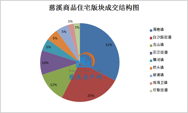 慈溪商品住宅(含别墅)各版块成交情况中,排名前三版块:周巷镇备案13套,占上周商品住宅成交总量的32%;白沙路街道备案10套,分别占上周商品住宅成交总量的25%;龙山镇备案5套,占上周商品住宅成交总量的12%。