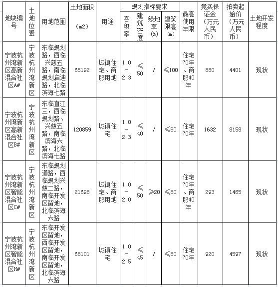 经慈溪市人民政府批准,慈溪市国土资源局决定以拍卖方式出让四宗国有建设用地使用权。现将有关事项公告如下: 一、出让地块的位置、出让地块的规划指标、土地用途、出让年限、起始价总价及竞买保证金等详见附表。 二、本次国有建设用地使用权拍卖出让活动在浙江省土地使用权网上交易系统进行。竞买申请人须办理数字证书(CA认证),方可参加网上交易活动。网上交易系统网址:http://land.zjgtjy.cn/GTJY_ZJ/go_home 三、竞买人资格 中华人民共和国境内外的自然人、法人和其他组织,但法律、法规对申请人另有限制的除外。申请人应当单独申请。 四、本次国有土地使用权拍卖出让采用增价拍卖方式,按照价高者得原则确定竞得入选人。 五、本次国有建设用地使用权拍卖出让事宜详见拍卖出让须知等文件,可登录浙江省土地使用权网上交易系统浏览或下载。 六、出让时间安排 1、公告时间:2018年10月30日至2018年11月20日; 2、报名时间:2018年11月19日9:00至2018年11月20日16:00时; 3、保证金缴纳时间:2018年11月19日9:00至2018年11月20日16:00时; 4、拍卖时间:2018年11月21日10:00时开始; 以上时间均以浙江省土地使用权网上交易系统时间为准,竞买保证金到达指定账户时间以银行信息系统为准。竞买保证金到账后,网上交易系统自动确定该竞买申请人的竞买资格,颁发相应宗地的《竞买资格确认书》。 七、其他需要公告的事项 (一)本次国有建设用地使用权拍卖出让不设底价。 (二)竞得人交纳的竞买保证金,在确定竞得人后自动转作受让地块的定金。未竞得人交纳的竞买保证金,无特殊情况在本次网上交易活动结束后5个工作日内予以退还,不计利息。 (三)付款期限 竞得人自《国有建设用地使用权出让合同》签订之日起30日内付清。 (四)全部自持,不得作为商品房出售。 (五)联系方式 出让人:慈溪市国土资源局 联系电话:0574-63991950 联系人:杨先生