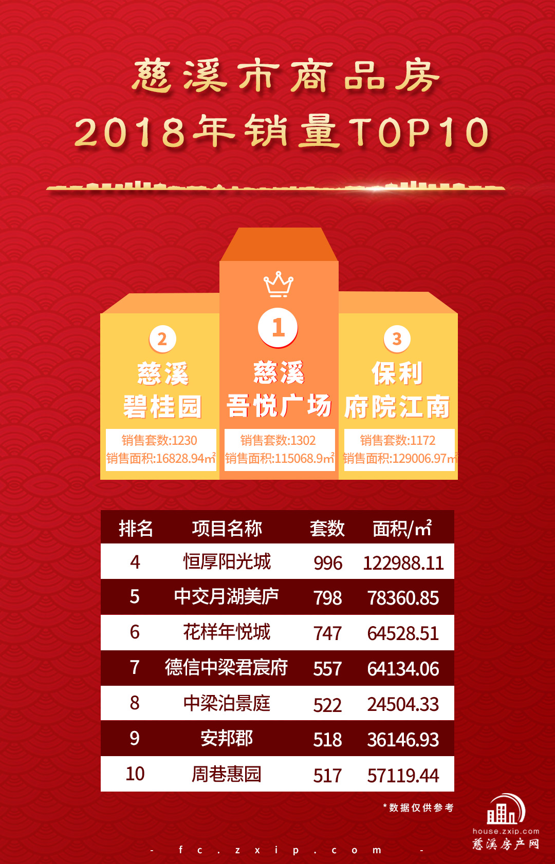 从成交排行榜上看,保利府院江南以883套的成交量领跑慈溪楼市摘得冠军宝座;而紧随其后的则是今年势头火热的新城吾悦广场,以803的成交量位居第二,而第三名则是由成交773套的元亨雅园夺下。
