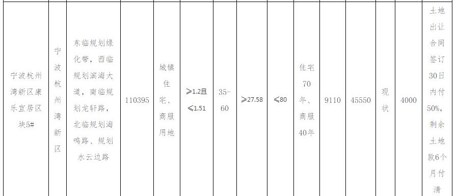 宁波杭州湾新区文游宜居区块4#;宁波杭州湾新区康乐宜居区块5#地块竞得人自《国有建设用地使用权出让合同》签订之日起30日内支付50%出让价款,180日内付清剩余价款;甬新Ⅲ201810#地块竞得人自《国有建设用地使用权出让合同》签订之日起30日内付清。